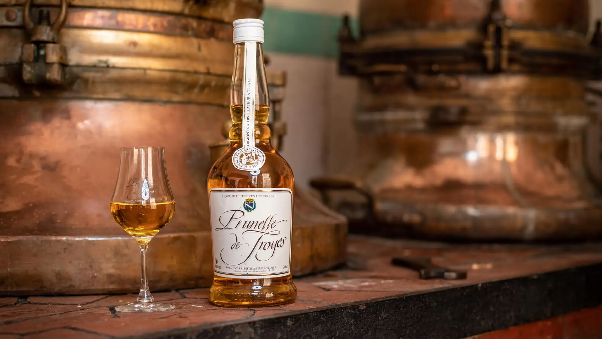 Elle est élaborée à partir de noyaux de prunelles sauvages (les fruits de l’épine noire). Ces noyaux sont broyés, puis mis à macérer dans l’alcool avant une double distillation dans de magnifiques alambics en cuivre que l’on peut encore admirer sur place. Le secret ? Une recette jalousement gardée qui inclut d’autres plantes pour lui donner sa complexité.